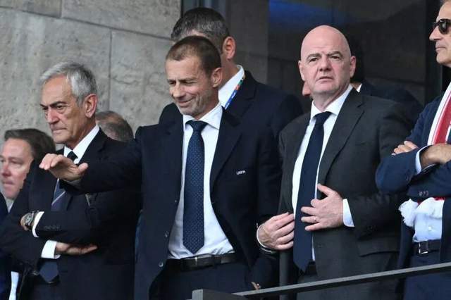 意大利足协主席格拉维纳(左)、欧足联主席切费林(中)和国际足联主席因凡蒂诺(右)在2024年欧洲杯上合影