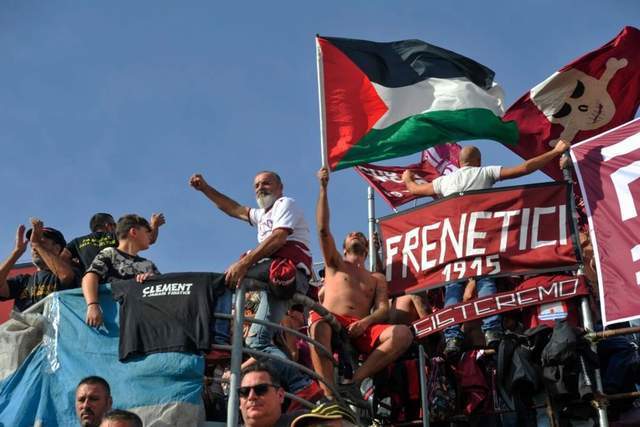 2023年10月15日,在意大利利沃诺,利沃诺足球队的球迷在利沃诺队对阵Tau队的比赛中挥舞着巴勒斯坦国旗。